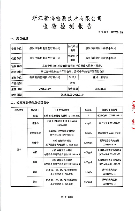 報(bào)告名稱:中華熱電2025年1月廢水檢測(cè)報(bào)告